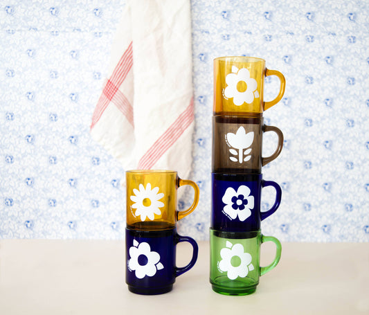 Set de 4 Mugs en Verre Rétros Bleu Fleurs - Duralex