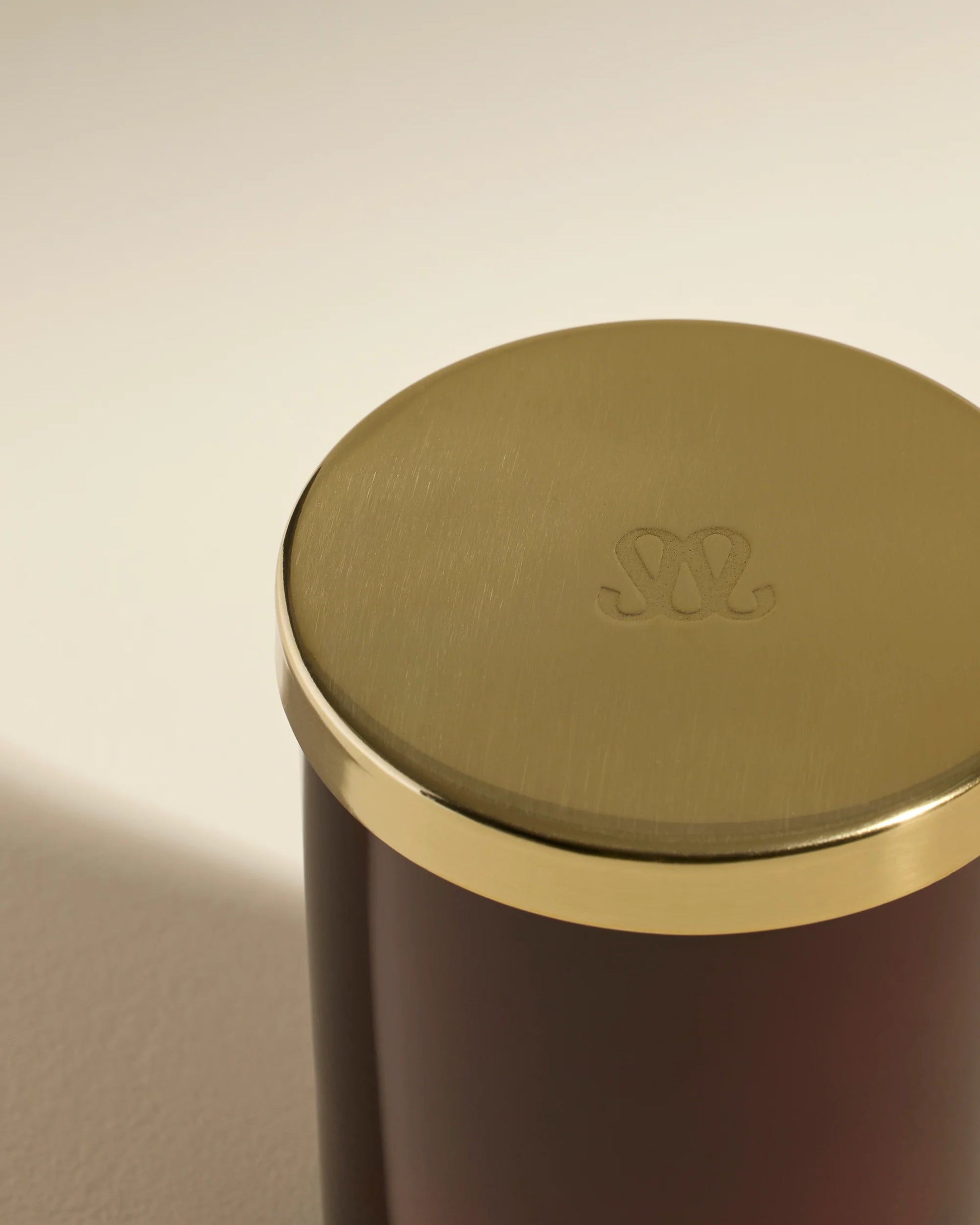 Récipient en verre teinté, couvercle en métal. Cire végétale à base de soja. Mèche en coton.