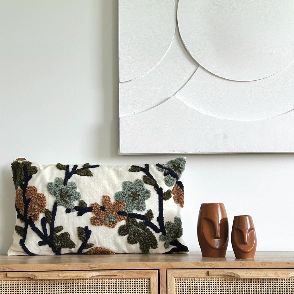 Le Coussin Fleurs Yoshi d’Opjet se démarque par ses motifs floraux en reliefs qui ajoutent profondeur et caractère à chaque pièce. La broderie fine sur la toile naturelle crée un jeu de textures et de couleurs, faisant de ce coussin un véritable objet décoratif qui attire le regard.