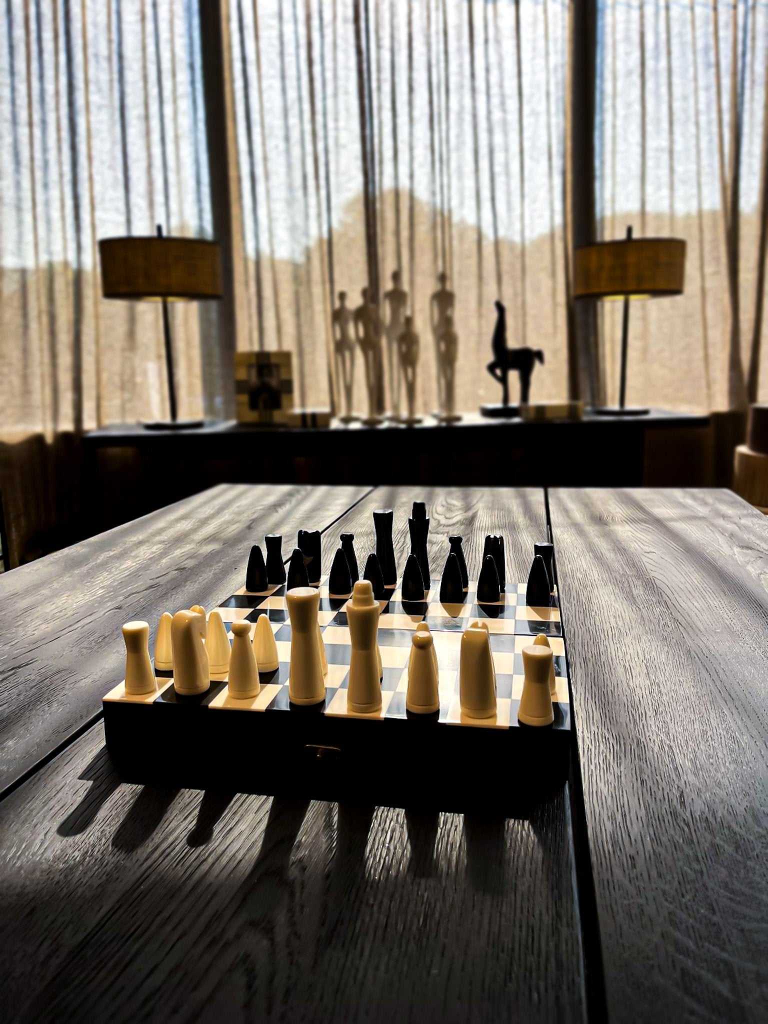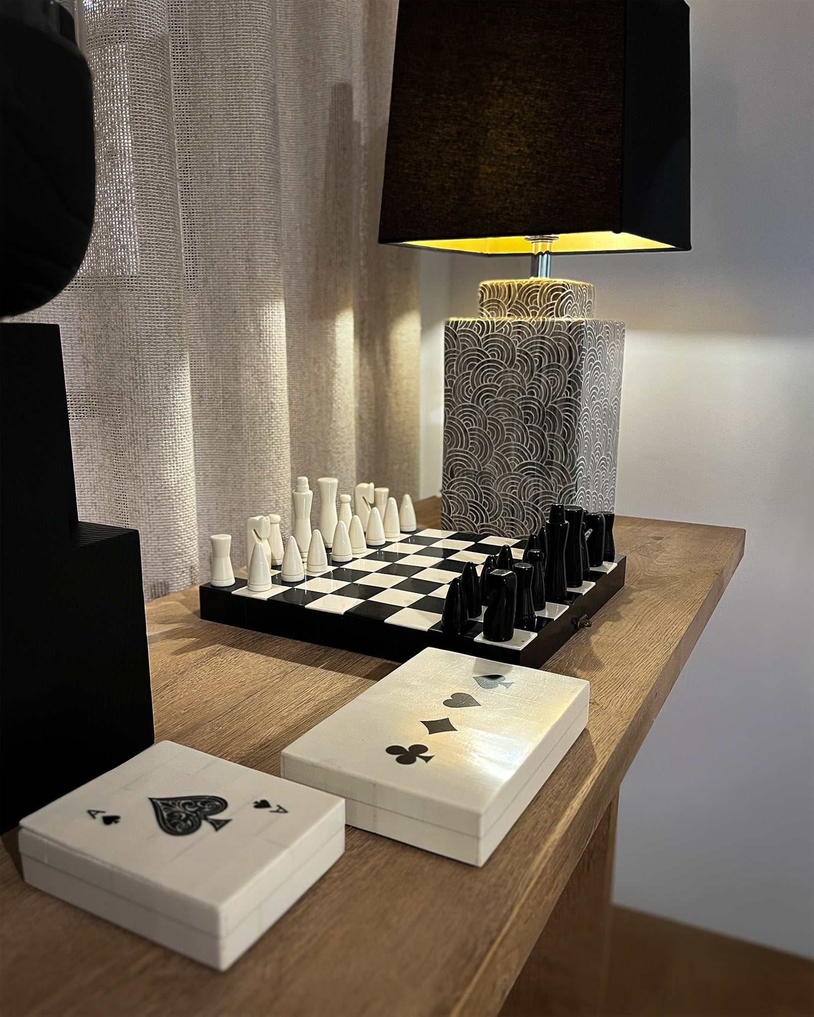 Réalisé en résine noir et blanc, cet échiquier séduit par sa finition soignée et son contraste raffiné. Les pièces minimalistes, pensées dans un esprit contemporain, confèrent à l’ensemble une allure chic et graphique. Chaque détail est pensé pour offrir une expérience de jeu fluide et agréable, tout en sublimant votre intérieur par son style sobre et design.