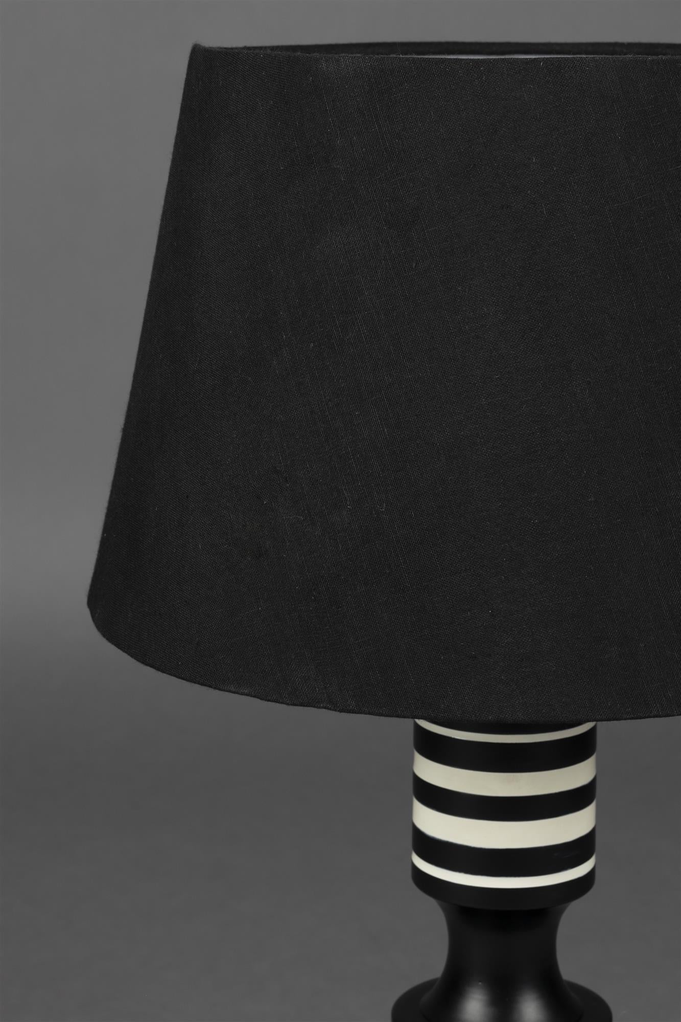 La lampe de table Virgil DutchBone puise son inspiration dans l’esthétique raffinée des années 1950. Son pied graphique, rythmé de rayures blanches brillantes sur fond noir mat, évoque immédiatement le design vintage et l’élégance intemporelle de cette période. Les variations d’épaisseur du pied renforcent son caractère sculptural et apportent une touche ludique qui capte le regard sans jamais en faire trop.