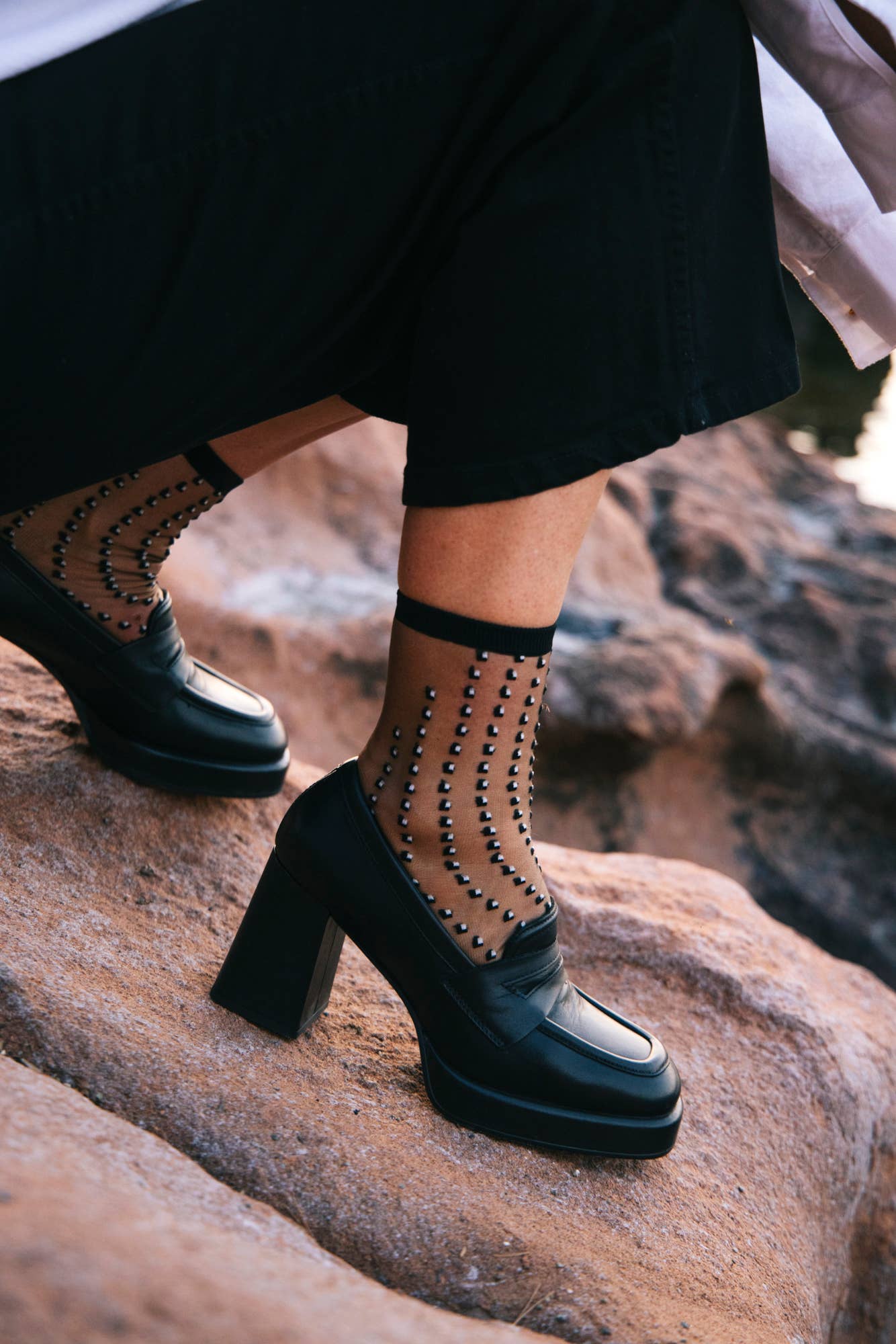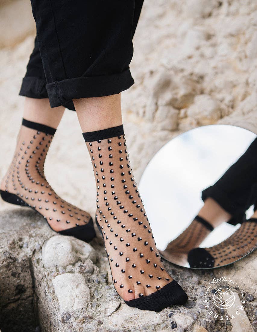 Les chaussettes Crescent Dunes Yellow / Noir d’Atelier Saint Eustache allient élégance et modernité. Inspirées des panneaux photovoltaïques du désert de Crescent Dunes au Nevada, elles offrent une touche unique à votre garde-robe. Le motif à pois jaunes ou noirs habille délicatement vos chevilles, tandis que le design sobre et raffiné apporte une touche de chic. Parfaites pour un look élégant, ces chaussettes s'associent avec des mocassins, une jupe ou un pantalon carotte pour une tenue pleine de caractère et de style.
