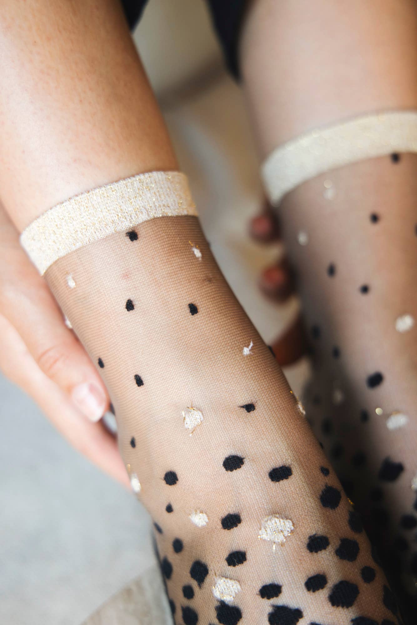 Les chaussettes Nakameguro de Atelier Saint Eustache s'inspirent de l'envolée des pétales de cerisier sur le canal de Nakameguro, avec un dégradé de pois noirs sur un fond transparent qui revisite le classique plumetis. Disponibles en deux couleurs élégantes, or, silver, noir et denim, elles ajoutent une touche raffinée à toutes vos tenues.