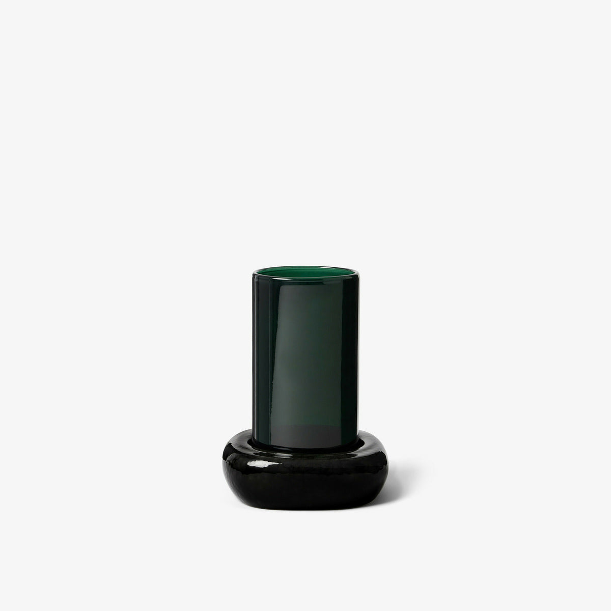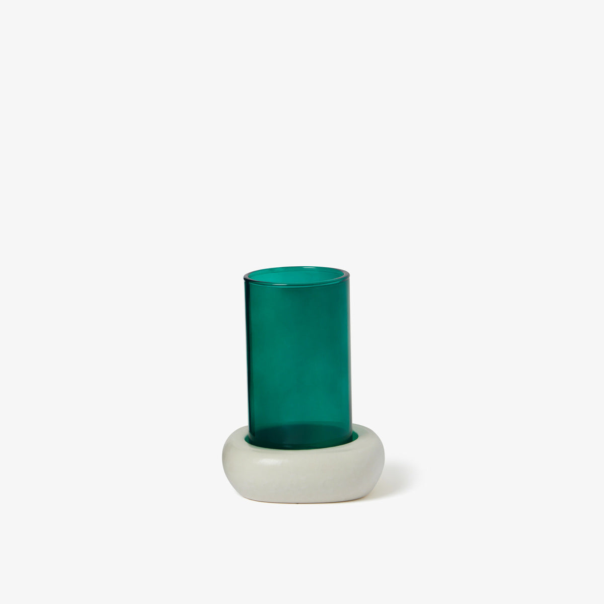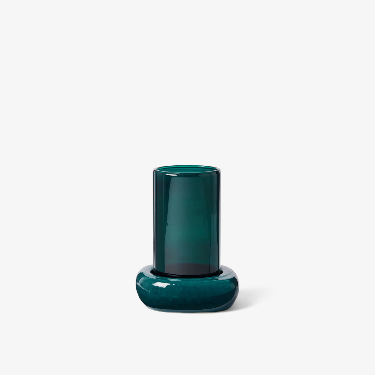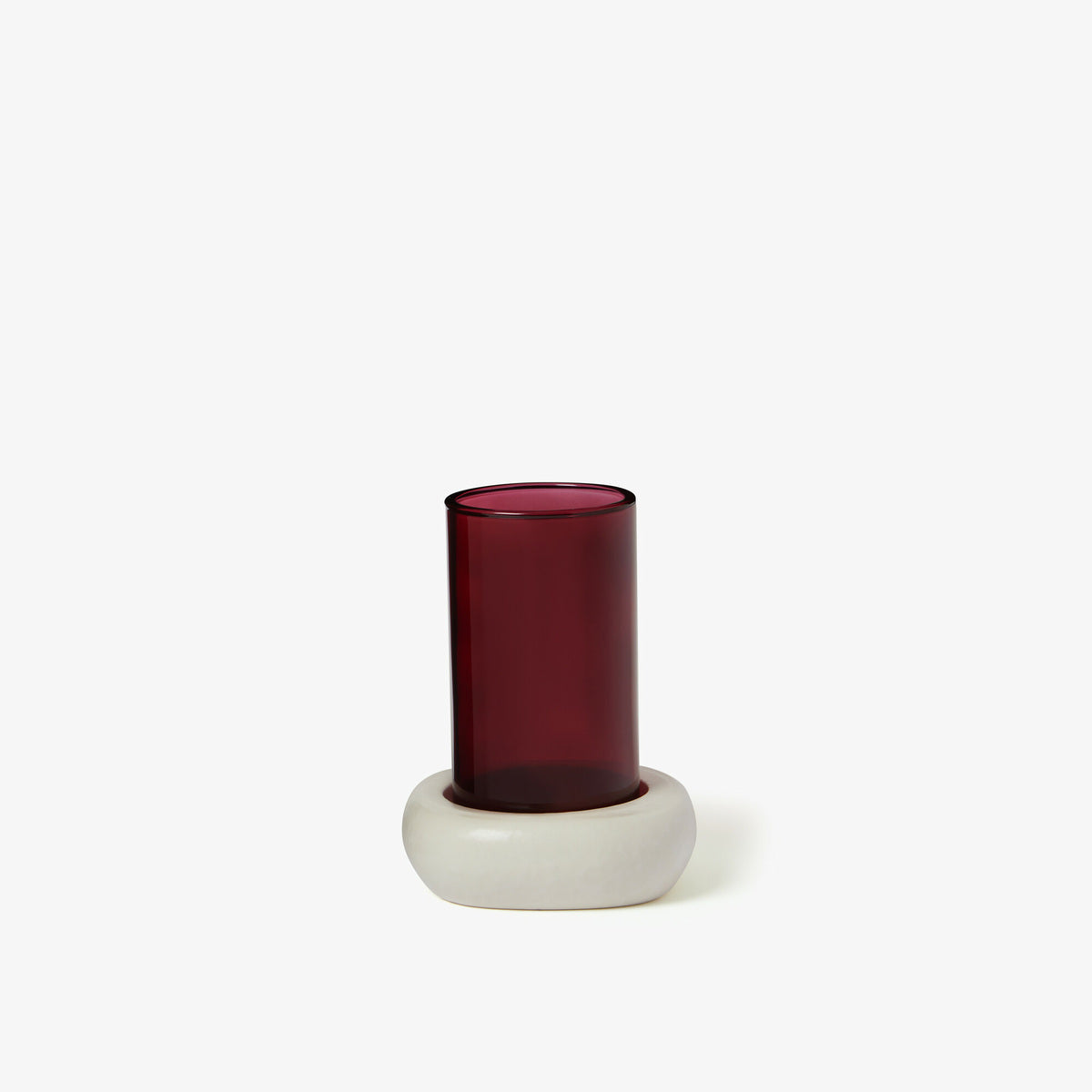 Le socle revêt un émail réactif mat ivoire contrastant avec le verre coloré Lagon ou Cassis, travaillé pour que l'opacité soit parfaitement équilibrée.