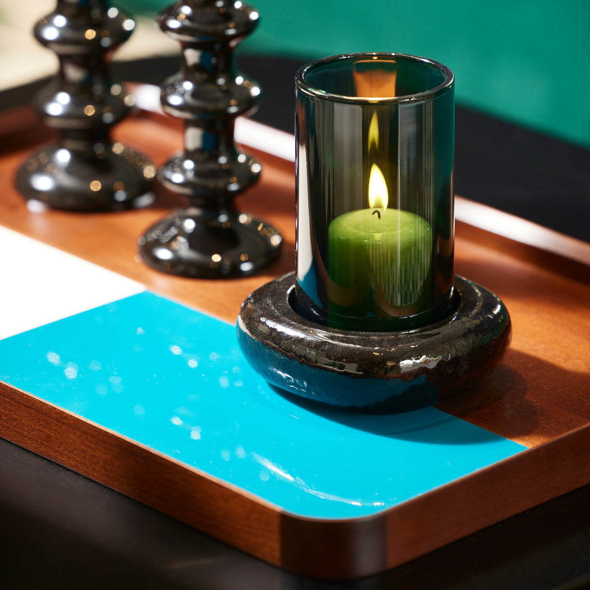 Jeux de matières. L'alliance de la céramique émaillée et du verre coloré pour créer de fabuleux jeux de lumières lorsque l'on y pose une bougie.