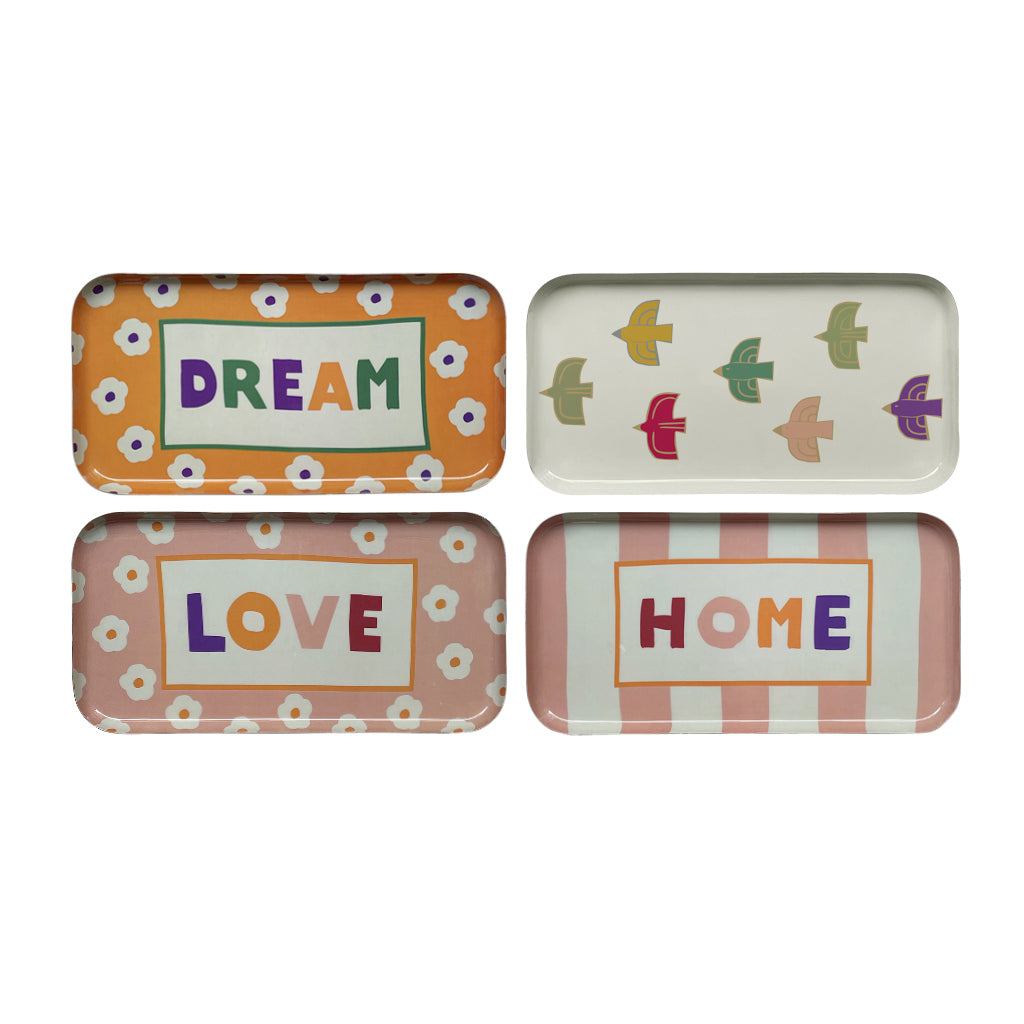Le Plateau Rectangle Dream d'Opjet est un plateau en métal aux couleurs vives et joyeuses, pensé pour mettre de bonne humeur dès le premier regard. Trois modèles présentent des mots inspirants tels que dream, home ou love, et un modèle est orné d’hirondelles délicates, parfait pour apporter énergie et optimisme à votre intérieur. Dimensions : 15 x 30 cm.