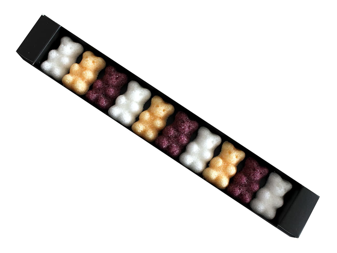 Apportez une touche ludique à vos boissons avec la Réglette de 10 Sucres en Forme d’Oursons Ercus, un assortiment artisanal français comprenant 4 oursons blancs, 3 oursons roux et 3 oursons violets colorés naturellement.