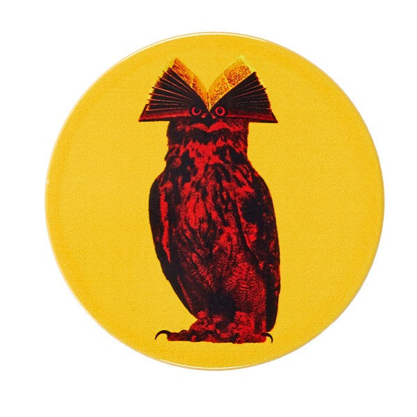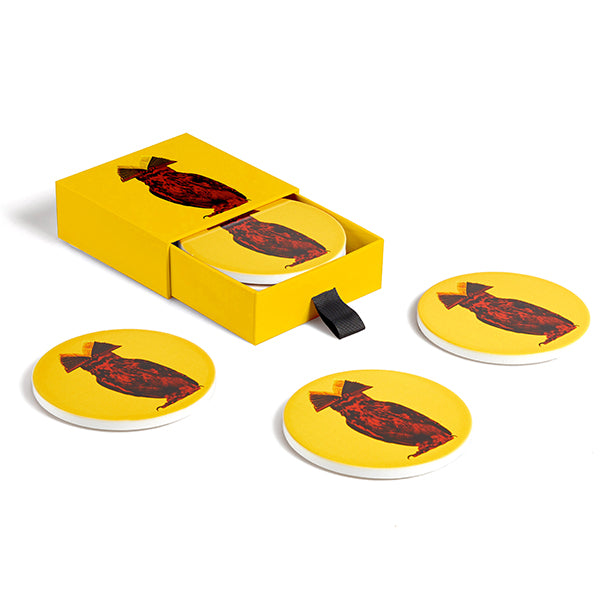 Le Set de 4 Dessous de Verre en Céramique Hibook de Gangzaï apporte une note à la fois poétique et décalée à vos moments de dégustation. Chaque dessous de verre rond de 10 cm de diamètre met en avant un hibou rouge au regard mystérieux, coiffé d’un livre ouvert en guise de plume, le tout sur un fond jaune éclatant.