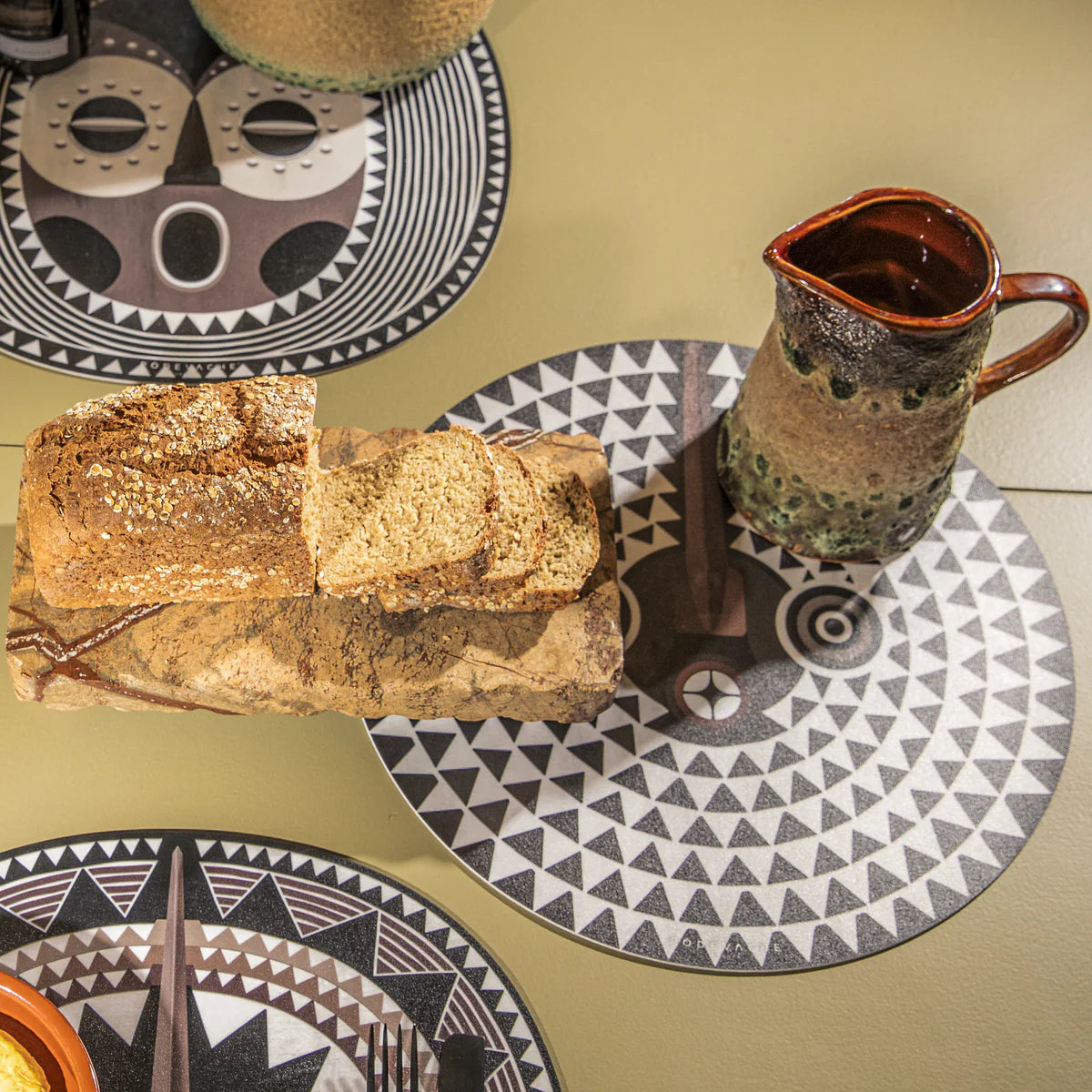 Disponible en deux versions, le Set de Table Masque Baoulé et le Set de Table Masque Idimu, il met en avant des motifs graphiques et ethniques inspirés des arts tribaux. Ces dessins originaux apportent une touche décorative unique à votre table, qu’il s’agisse d’un dîner en famille, d’un repas entre amis ou d’un brunch improvisé. Avec leur format rond de 38 cm, ces sets deviennent de véritables éléments de décoration qui soulignent le caractère de votre intérieur.