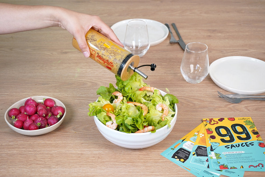 Le livret “99 sauces” inclus vous guide pas à pas pour créer des sauces savoureuses adaptées à chaque repas. Vous y trouverez des recettes pour salades, grillades, street food, apéros ou desserts, de quoi varier les plaisirs au quotidien et dire adieu aux sauces industrielles. Avec le shaker Cookut, la créativité s’invite dans votre cuisine et vos repas gagnent en authenticité.